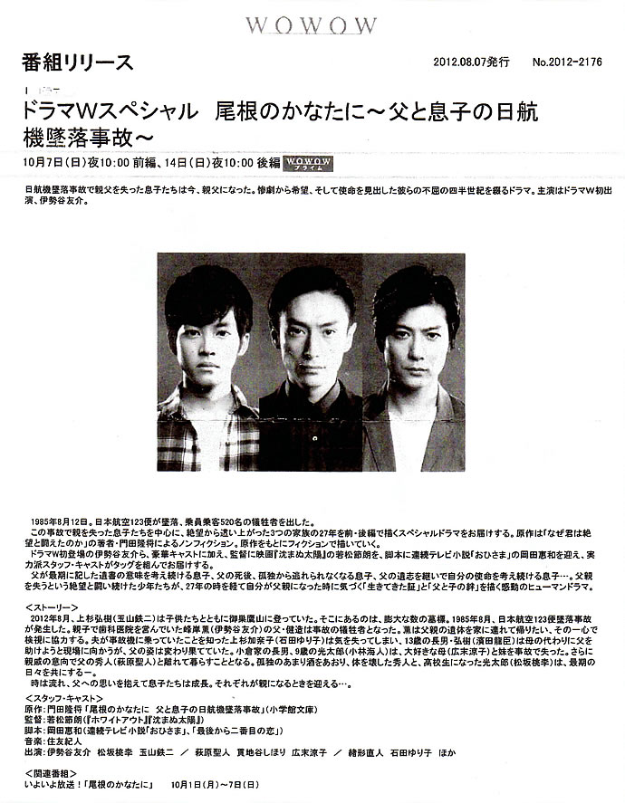 「沈まぬ太陽」の若松節朗監督がWOWOWドラマ[尾根のかなたに~父と息子の日航機墜落事故~」を制作中です。 ドラマは前編が10月7日(日)、後編が10月14日(日)、ともに午後10時からWOWOWプライムで放送されます。 WOWOWプライム受信してない方は2ヶ月間無料キャンペーンがございますので9月になりましたら0120-808-493にお申し込み下さい。