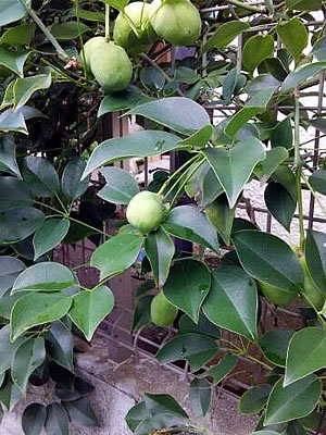 庭隅の枝切り葉付き柚子飾る ざぼん