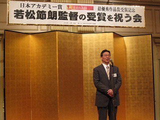 祝辞を秋田市東京事務所の千葉所長が「秋田のPRに貢献した功績は大きく、これからも映画界でのご活躍を期待します」と述べられ、女優の浅利香津代さんも「芸能界でアカデミー賞を取るのは夢のまた夢、これからもますますいい映画を作ってほしい」と祝福。