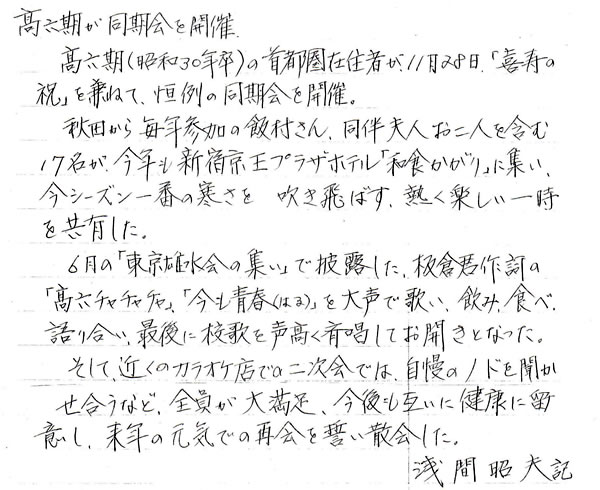 この16期生の仲間で一年に2度、3度と会ううちに、だんだん離れ難くなって行くというのは、どうしたことだろうか。仲間内で、その人間の中味を知れば知るほど、本当に良い奴ばかりだ。これこそが、わが“秋商の伝統”ということだろうか。